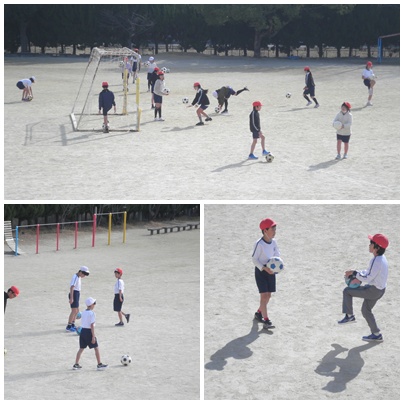 この時期にしては暖かい運動場では、6年生が2クラス合同で、 サッカー型ゲームをしました。 人数が多いけれど、多いなりの良さもあります。 いろいろな子の動きをみて、ボールの扱い方を学ぶ姿が見られました。
