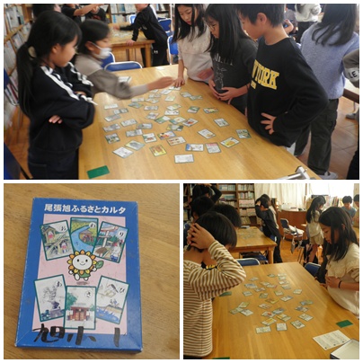 4年生が図書室の大きな机を使って 「尾張旭ふるさとカルタ」をしました。 こういうアナログなゲーム性の高い活動を通じて、 自然と尾張旭を知っていきます。 大変盛り上がっていました。