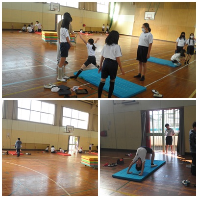 5年生の体育の授業では、グループに分かれて マット運動の技の練習をしました。 仲間の技をみてアドバイスすることで、自分の技を振り返っていく過程に 大きな学びがあります。 運動量も多く、熱気を感じました。