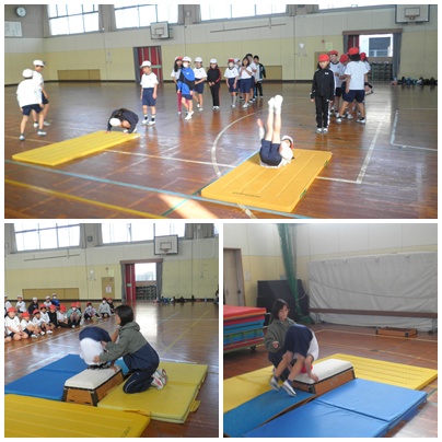 3年生の体育の授業では、マット運動に挑戦しました。 台上前転の練習もしました。 低い台からの挑戦でしたが、とても意欲的に取り組み姿が見られました。