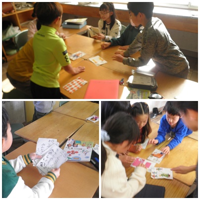 2年生では自分たちで作成したカルタで盛り上がっていました。 タブレットを使ってデザインし、それを印刷して、カルタにしました。 学習のまとめとしても有意義な活動でした。
