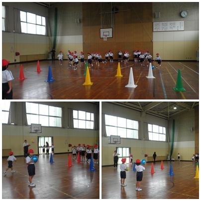 久しぶりの体育館での体育をしました。 ボールを投げる子、そしてそれを捕る子。 ボールのバウンドに合わせて捕球体制に入るのは、 なかなか難しいようですが、感覚を養うには大切な運動です。