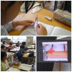 3年生の算数の授業では、コンパスを使って円を描く練習をしました。