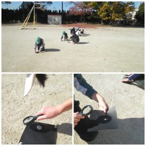 3年生が運動場で理科の実験をしました。