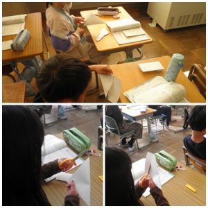2年生の算数の授業では長方形の辺と辺を合わせて折り、