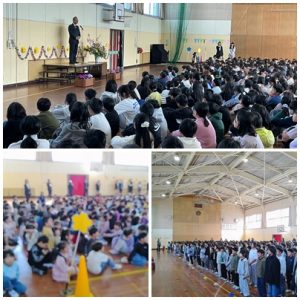 本日、着任式、始業式、対面式の流れで体育館で式を行いました。