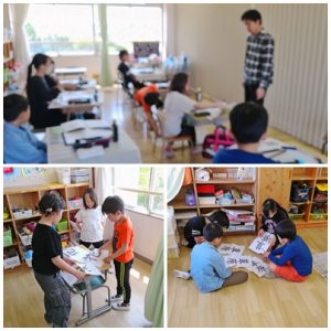 手本をみてどこを気を付ければいいか、みんなで話し合っています。