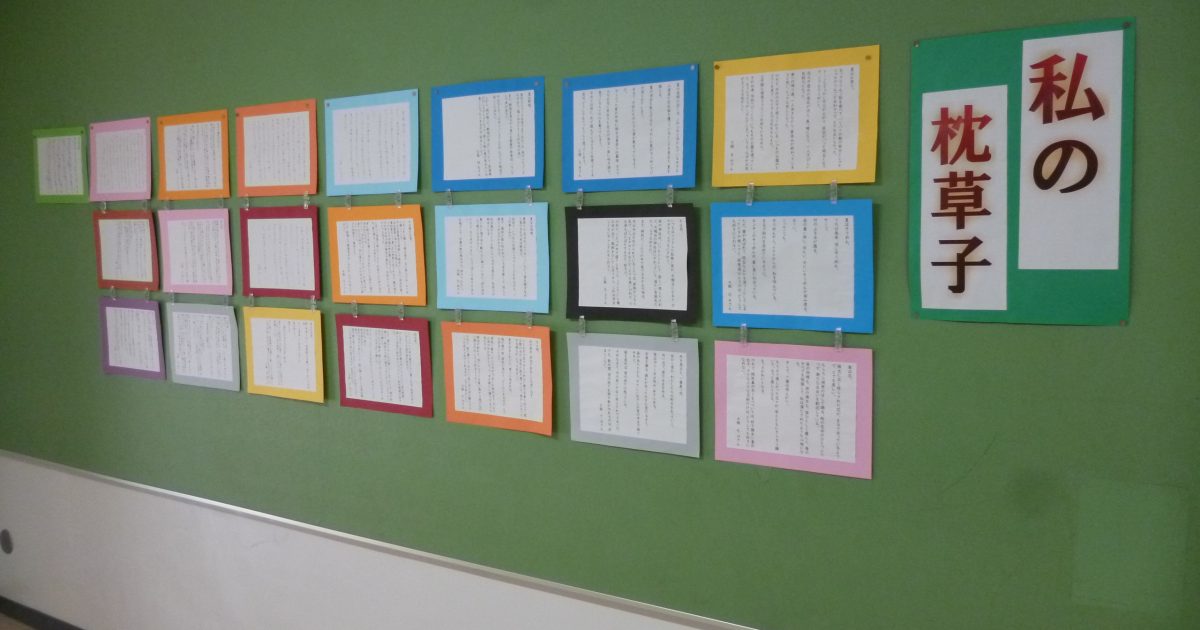 2年生の掲示板には、「私の枕草子」の作品が掲示されています。清少納言が季節について想いを自由に書き記したように、生徒たち自身の感じたことが心の赴くままに書かれています。学校公開で来校された際にご覧いただければ幸いです。