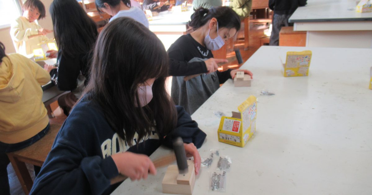 1月14日(水)3年生が図工「トントン どんどん くぎうって」の学習で、木に釘を打っていました。金づちを使うのは初めてなので、どの子も真剣に取り組んでいました!