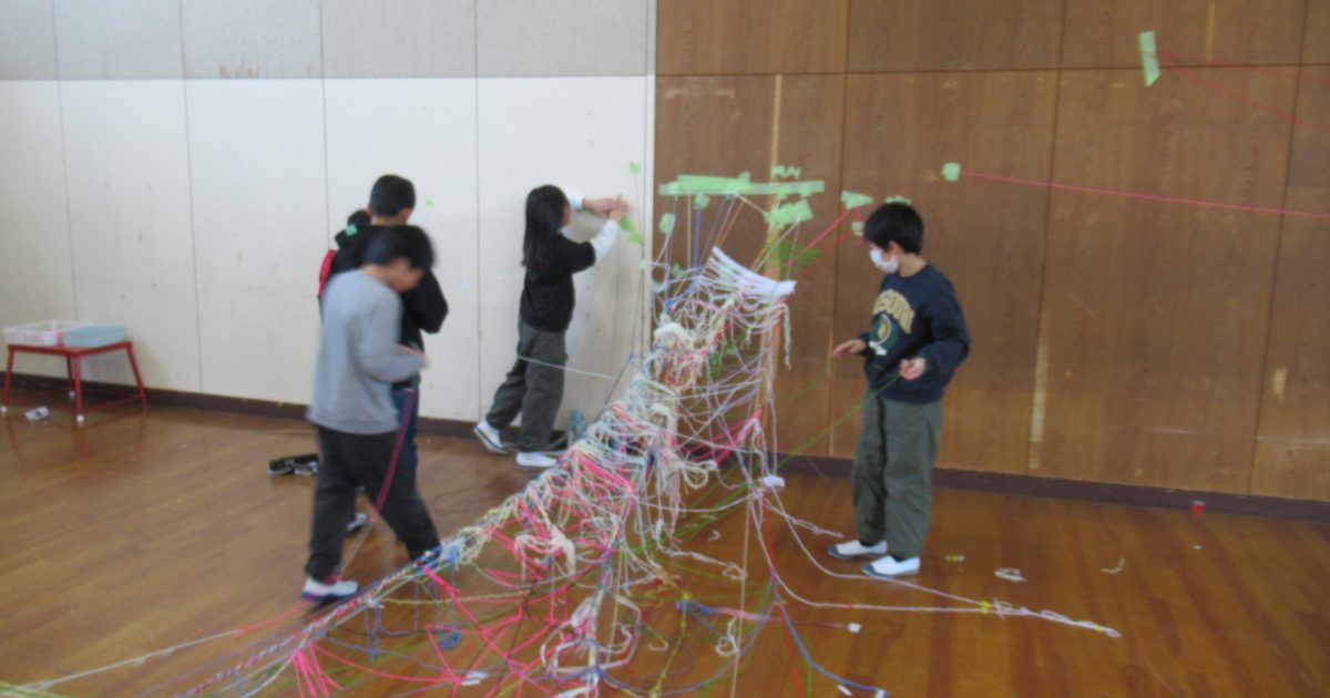 2月4日(水)3年生が体育館で、図画工作科「ひもでつないで」の授業を行いました。体育館の中で3年生全員が、思い思いの色のひもをぐるぐるに巻いたりつないだり結んだりしながら、造形的なよさやおもしろさを楽しみました。