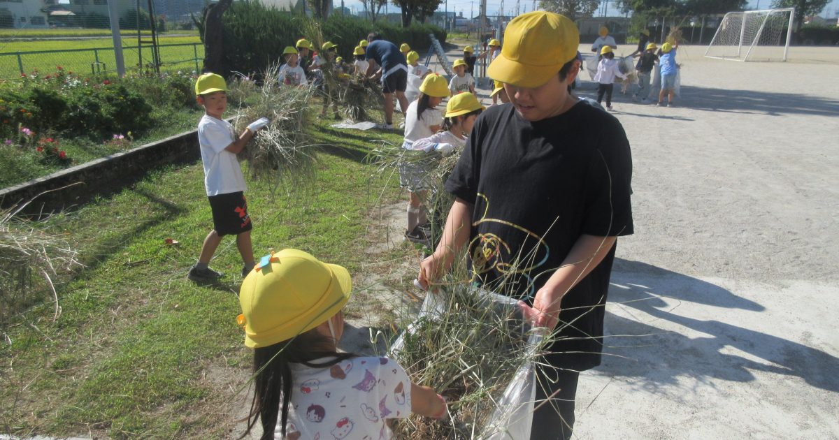 9月30日(火)児童集会で、全校そろって「除草作業」を行いました。先週土曜日に地域の方やPTAサポート隊の皆様が刈ってくださった草を集めて、ゴミ袋につめる作業を行いました。たくさん草を刈っていただいたので、袋につめるだけ […]