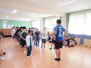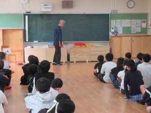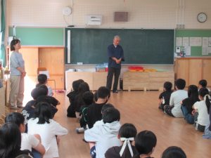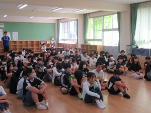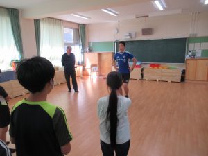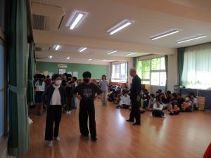 9月24日(水)6年生が、総合的な学習の時間に、日本の伝統文化を学ぶため「狂言」を体験しました。講師の先生をお招きし、狂言について、実際に声の出し方や歩き方などを見せていただきながら、教えてもらいました。子どもたちは楽しく体験活動を行いました。