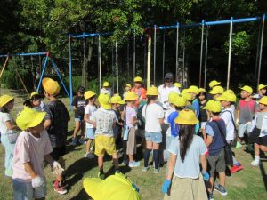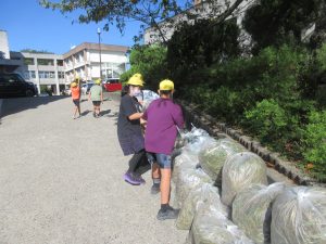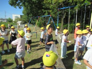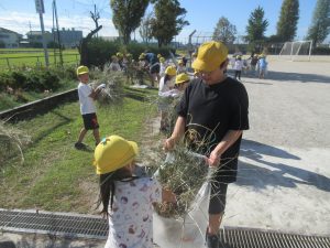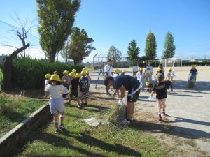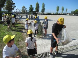 9月30日(火)児童集会で、全校そろって「除草作業」を行いました。先週土曜日に地域の方やPTAサポート隊の皆様が刈ってくださった草を集めて、ゴミ袋につめる作業を行いました。たくさん草を刈っていただいたので、袋につめるだけでも大変な作業となりました。子どもたちは汗いっぱいかきながら、一生懸命に取組みました。1年生の保護者の方がお手伝いに来てくださり、大変助かりました。校庭がきれいになりました!ありがとうございました。