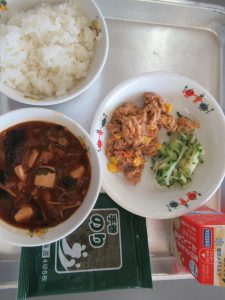 11月17日(月) 今日から1週間は「あじわおう!愛知の秋の味覚週間」です。昼の放送で、給食委員会から、今日の献立について、「愛知県でつくられた食べ物をたくさん使っています」と紹介がありました。みそ汁に入っている豆腐と油揚げ。ハリハリ漬けに入っているきゅうり。手巻きのり、米と牛乳も愛知県産だそうです。味わって食べましょう!