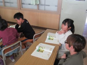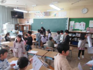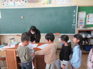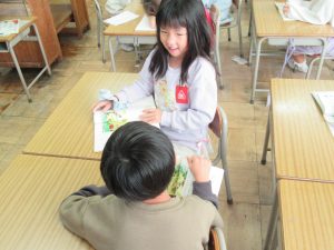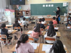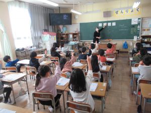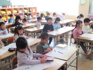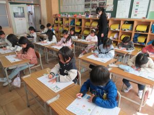 12月1日(月)1年生の教室をのぞいてみると、どの学級も落ち着いて授業に取り組んでいました。1組は国語で、教科書の挿絵を見ながら、となりの友達と自分が考えたお話を伝え合っていました。2組は、国語のテストを返却され、自分が間違えたところを直して先生に再度丸付けをしてもらっていました。3組はカタカナの学習で「ソ」「ン」など、間違えやすい文字の練習をしていました。1年生もしっかり学習を進めています。