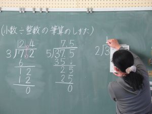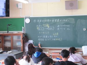 12月10日(水)4時間目、5年1組と4年1組が算数の授業を行っていました。5年生は「割合」、4年生は「小数のわり算」の授業でした。どちらも難しい単元です。先生はゆっくり丁寧に説明をしていました。子どもたちも真剣に話を聞いていました!算数は問題が解けると楽しい教科です。みんながんばって!