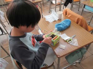 12月15日(月) 理科は実験や観察などを通して理解を深めていく教科です。3年生は、「「音のせいしつ」の学習で糸電話などをつくって音の伝わり方を調べていました。どの子も自分なりに工夫しながら楽しく学習していました。