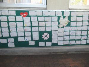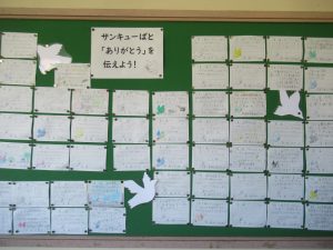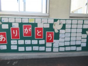 12月19日(金)まで、尾張旭市の人権月間となっています。本校では、人権月間の取組として「サンキューばと運動」を行っています。友達や家族に「ありがとう」を伝える取組です。2階の渡り廊下や3階廊下に子どもたちが書いた「ありがとう」のメッセージが掲示されています。「〇〇ちゃん、いつも遊びにさそってくれてありがとう」と同じクラスの友達へ書いてあるものや、「〇〇さん、お世話係をやってくれてありがとう」など、1年生が6年生に宛てて書いてあるものもありました。家族に「ありがとう」と書いている子もいました。「ありがとう」と言い合えることが素敵ですね!