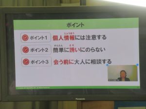 1月21日(水)5時間目に、6年生がNTTドコモの方とZoomでつなぎ、「スマホ・ネット安全教室」を行いました。「情報活用とリスクを考えよう」という内容で、SNSでの発信や出会いは危険が伴うことについて考えました。ご家庭でもスマホの使い方について話し合っていただけるとありがたいです。