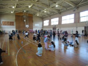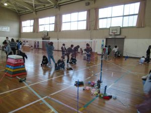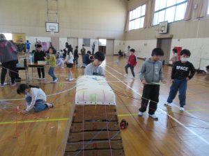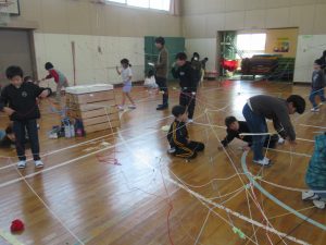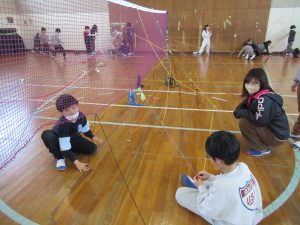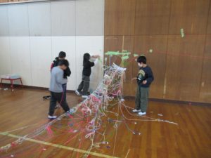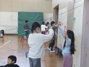 3年 3年図工の授業 2026.02.04 by e08mg 0 2月4日(水)3年生が体育館で、図画工作科「ひもでつないで」の授業を行いました。体育館の中で3年生全員が、思い思いの色のひもをぐるぐるに巻いたりつないだり結んだりしながら、造形的なよさやおもしろさを楽しみました。