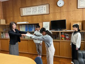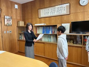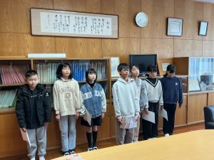 児童会 令和8年度前期児童会役員認証式 2026.02.24 by e08mg 0 2月24日(火)朝、校長室で令和8年度前期児童会役員の認証式を行いました。全校児童に向けて、会長から「笑顔あふれる学校にしましょう!」とあいさつがありました。大変立派でした!