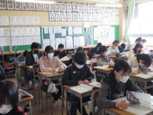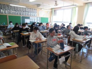 3月4日(水)今日は本当は、いつもお世話になっている方をお招きして「感謝の会」を開き、そのあと、「6年生を送る会」を行う予定でした。しかし、6年間お世話になった皆様に一番お礼を伝えたい6年生がインフルエンザで学級閉鎖になったため、3月6日(金)に延期しました。6年2組と6年3組はいつも通り、1時間目は国語の授業「海の命」を行っていました。