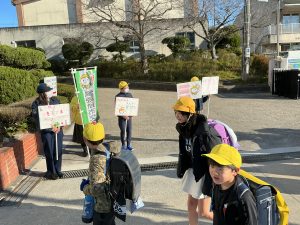 3月10日(火)、本年度2回目の交通少年団による交通安全啓発活動が行われました。団員は守山警察署のパトカーに乗車し、旭丘小学校区内を周回しながらアナウンス啓発を実施したり、校門付近で警察官と一緒にポスターを提示して安全啓発を呼びかけたりしました。