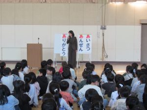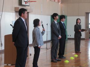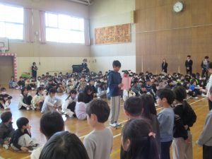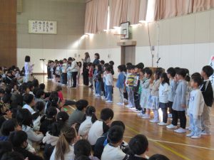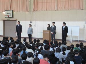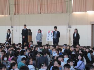 4月9日(木) 今日は、体育館で、今年度新しく本校にお越しくださった先生方の着任式と、1学期始業式、その後、在校性と新1年生の対面式を行いました。始業式では、校長先生から3つの「あ」の約束と「あんしん」という今年度の目標について話がありました。新1年生との対面式では、児童会長からの歓迎の言葉と新1年生からの「おねがいします」という言葉に、大きな拍手が送られました。また、新しい担任の先生と学活の授業を行いました。
