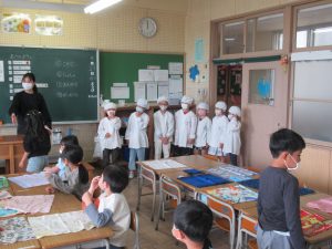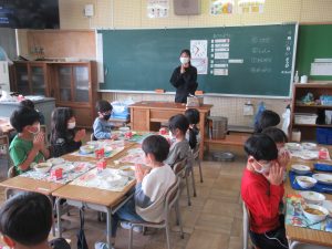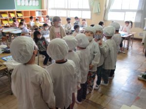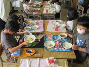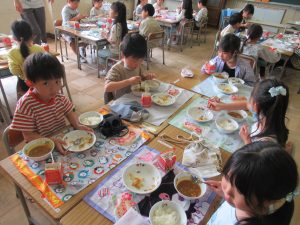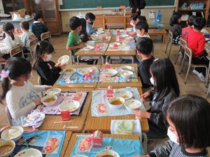 4月21日(火)今日から1年生の給食が始まりました。1年生が初めて給食を食べる日は、必ずカレーライスです。今日は、カレーライスとお祝いのデザートがでました。給食当番の児童は、ご飯やカレーを上手におわんによそうことができました。お家でも練習してください。