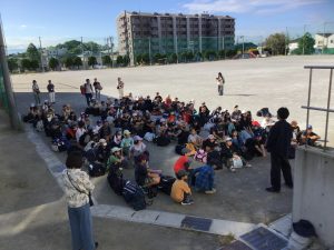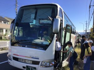 先程、5年生は、出発式を行い、野外活動に出発しました。