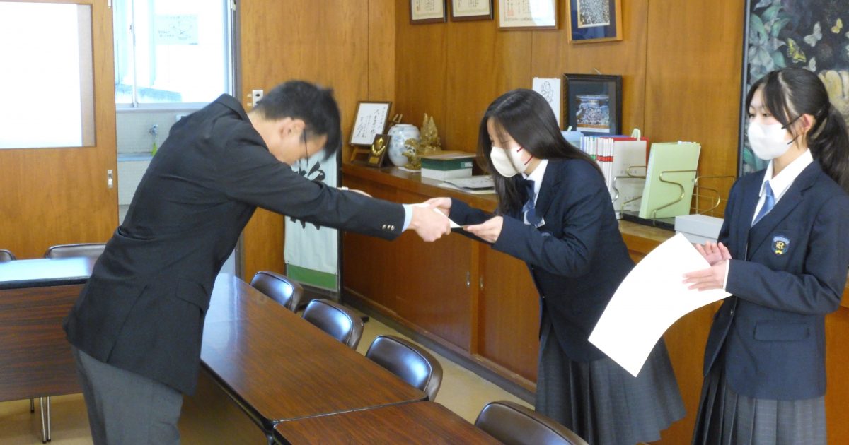 1月9日に弓道部の表彰がありました。2名の部員が初段に合格しました。3年生の先輩も祝福に来てくれました。今後も精進しましょう。