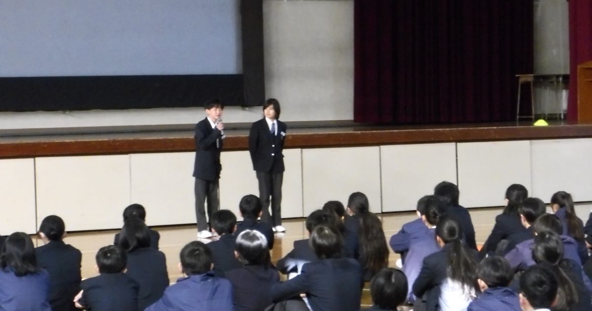 12月22日に学年集会がありました。授業の関係で1.2年生しか見れませんでしたが、各学年とも室長会を中心に趣向を凝らした会となりました。長い2学期を振り返り、3学期に向けて決意を新たにするよい機会になったと思います。
