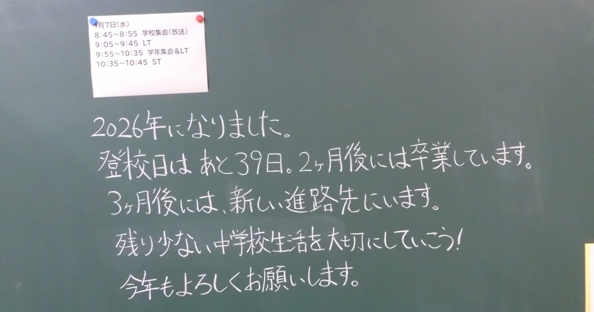 2026年1月7日。早朝の各クラスの黒板を見に行くと、先生方からのメッセージがありました。3年生の残りの登校日は40日だそうです。一日一日を大切に、味わって過ごしましょう。