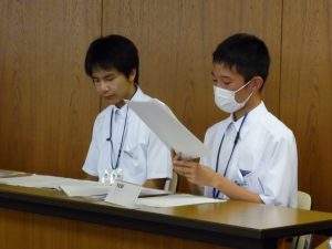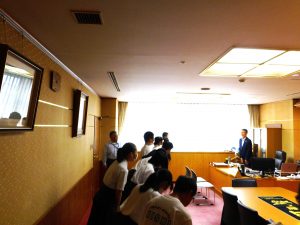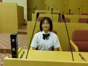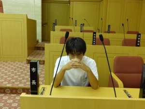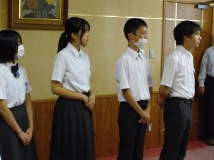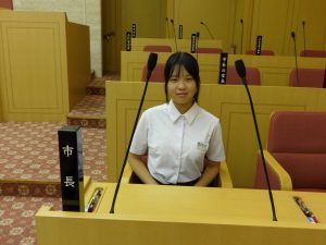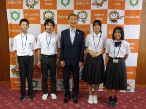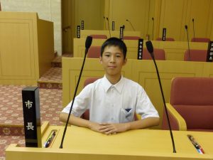 9月2日の午後に市長を囲む子ども会議が行われ、本校を代表して4名の生徒会役員が参加しました。事前に「私が推す尾張旭の魅力と広めるために自分たちができること」というテーマで意見作文を書き、それぞれ「自然との共生」「無形文化財の魅力に目を向ける」「自然豊かな尾張旭」「自然あふれる尾張旭市」という題で発表しました。会議の前には、市長室や議場を見学することができ、なかなかできない体験をすることができました。4名の代表の皆さんは、堂々とした発表ぶりでとても感心しました。ご苦労様でした。