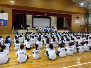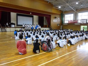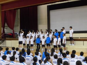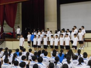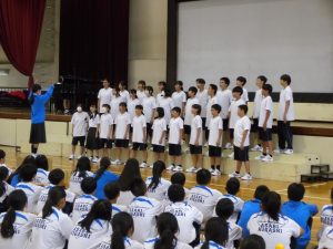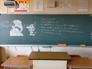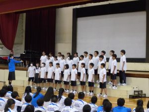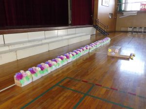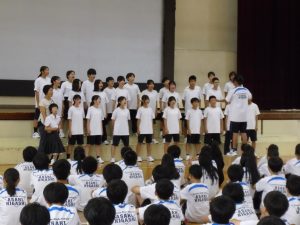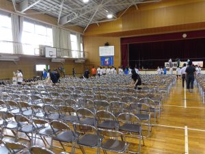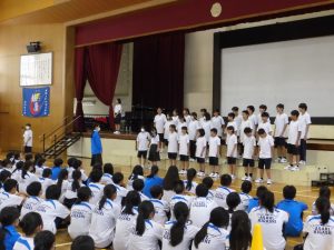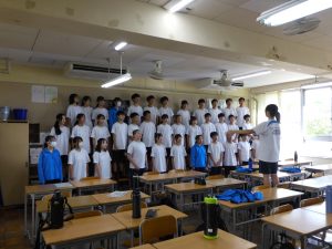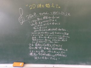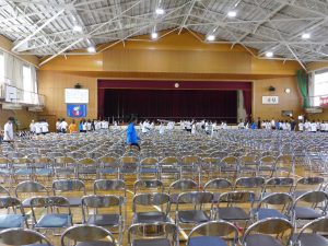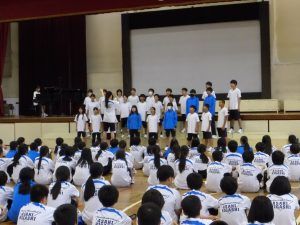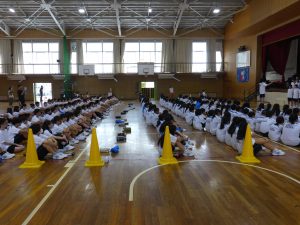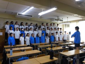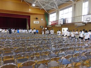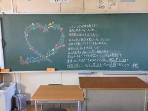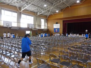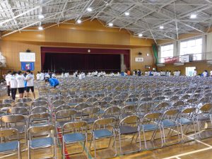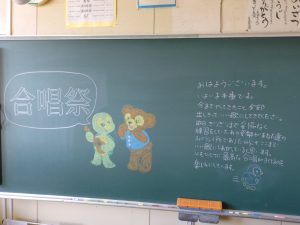 9月30日(火)、合唱祭当日の朝です。昨日は1年生の体育館練習の後、会場準備が行われました。生徒の皆さんが進んで準備に取り組んでくれたおかげであっという間に椅子が並びました。女子バレー部の皆さんは汚れた椅子を一台一台水拭きをしてくれました。Beルームの皆さんは、知らないうちに花飾りを作ってくれていました。手作り感満載の会場になりました。今朝、教室をのぞくと、黒板に担任の先生による熱いメッセージがありました。今年は保護者の皆さんにも聴いていただけます。あとは思い切り歌うだけです。生徒の皆さん、よろしくお願いします。