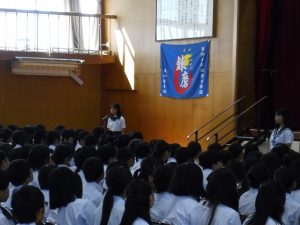 今回私たちが歌う曲は「Gifts」です。この曲はサビに入る前は、ソプラノ、あると、テノールでそれぞれ違うリズムで重なっているけど、サビの瞬間に3パートがそろいます。そしてこの曲は自信がなく、不安な気持ちを抱えている中学生に向けて、そしてこの曲がないものを探すのではなく、すでに持っているものに目を「自分に自信」「あなたがあなたでありますように」という自己肯定と向けてほしい作者のメッセージが込められています。希望を促す作者のメッセージが込められています。私たち3年A組は強い団結力があります。この団結力を活用し、今から皆さんに最高なメッセージを届けます。