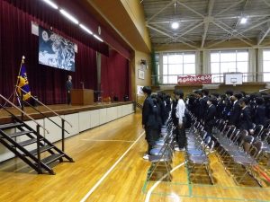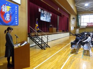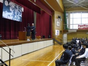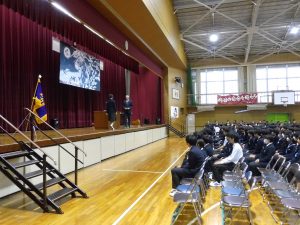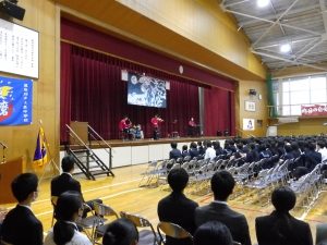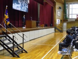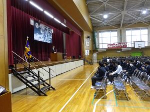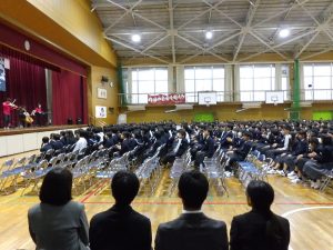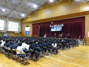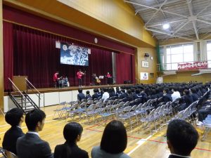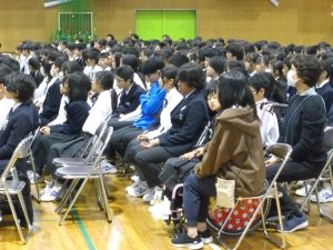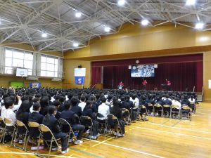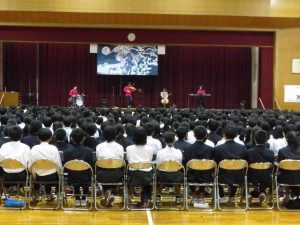 10月31日の午後には創立50周年記念式典と記念コンサートが行われました。式典では尾張旭市長の柴田 浩様をはじめ、32名の来賓の方にお越しいただきました。最初に校長先生にあいさつをしていただいた後に、市長さんからご祝辞をいただきました。その後、後援会長さんから記念品の目録を贈呈していただきました。最後に生徒会長からお礼を言葉がありました。生徒会長さんはお礼の言葉をすべて暗記し、堂々と話していてとても感心しました。また、市長さんが「はじめに、大きな声であいさつしましょう」「こんにちは」と仰ったときにも生徒の皆さんがとても大きな声であいさつを返していました。市長さんは、あとで「あいさつがとても気持ちよかった」と言ってみえました。とても誇らしく思いました。