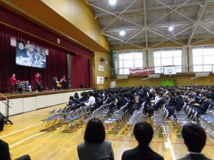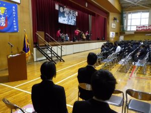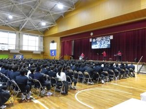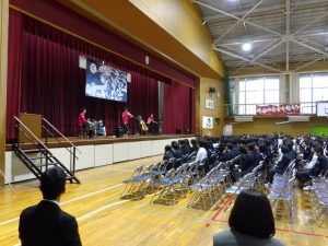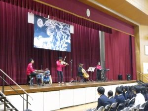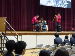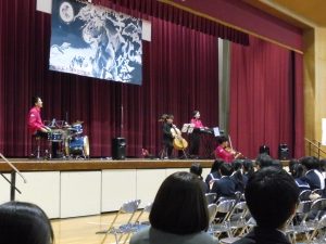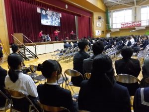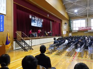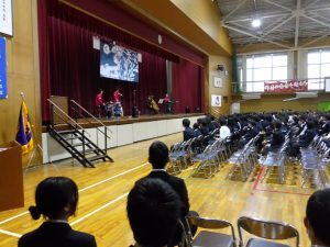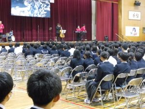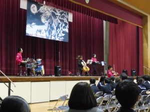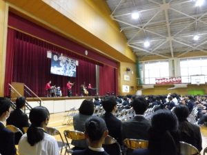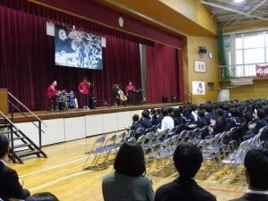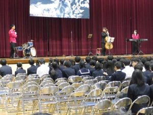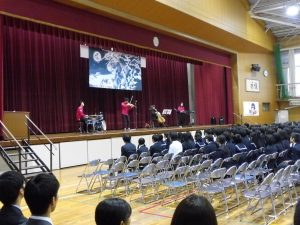 式典の後は、記念コンサートが行われました。本校卒業生の大竹かな子が所属する「LOVE KNOW」という3人組のグループによる演奏を楽しみました。大竹さんは、今年が東中学校創立50周年であることを回覧版で知り、真っ先に「コンサートをさせてください」と立候補してくださりました。日頃は、ピアノ・バイオリン・ドラムの3人組で活動されているそうですが、今回は特別にチェロも加わって本校生徒のために全力で演奏していただきました。テクニックはもちろんのこと、ユーモアもあり、最初は椅子に行儀よく座っていた生徒たちも手拍子をしたり、歓声や指笛を吹いたり、ドラムの真似をしたり、踊ったりとすっかり虜になっていました。自分が特に良かったと思ったのは、東中校歌のLOVE KNOWバージョンでした。情熱大陸のテーマ曲もよかったです。