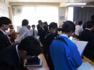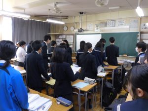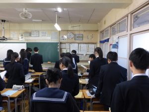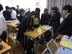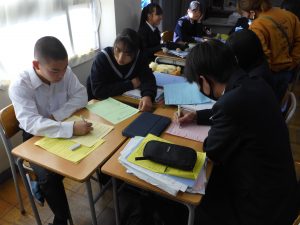12月9日4限に2年F組で英語の授業研究がありました。「How can we make a good presentation?」ということで、英語で学んだことを生かしてクラスでアンケートを行い、調査結果をまとめる、という授業でした。多くの参観者がいましたが、いつも通り、明るい雰囲気で楽しみながら参加しているのが印象的でした。好きな寿司のねたや、好きな映画、好きな学校行事等を身振り手振りをしながら質問し合い、調査結果をまとめていました。楽しい授業を見せていただき、ありがとうございました。