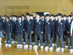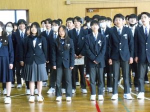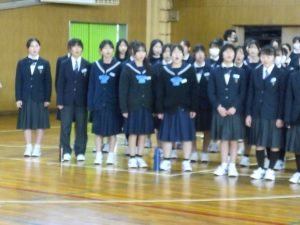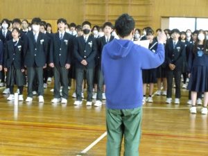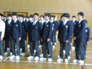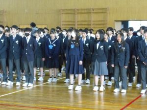 2月17日5限に体育館から元気な歌声が聞こえてきたのでのぞいてみたら、2年生が合唱練習をしていました。吹奏楽部の顧問でもある学年主任の先生の指揮に合わせて熱心に練習していました。2年生は何より元気があります。元気な歌声は人を元気づけてくれます。3年生を送る会や卒業式での合唱に期待します。