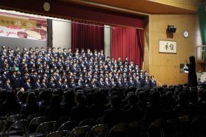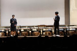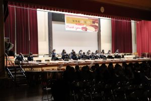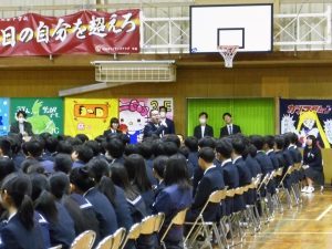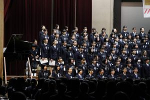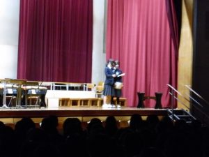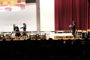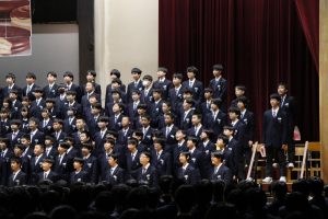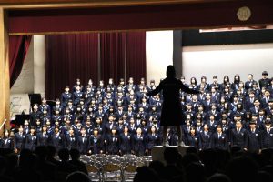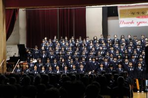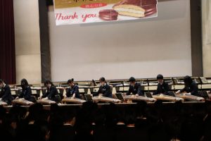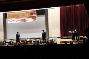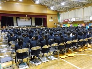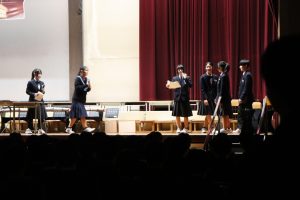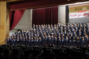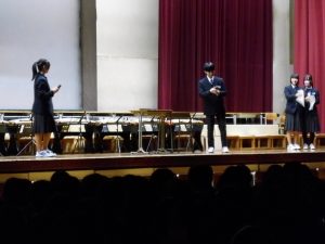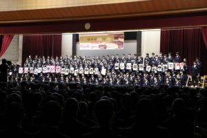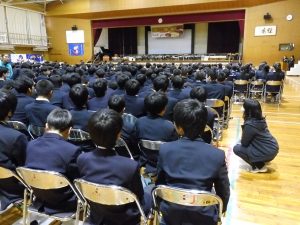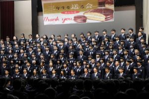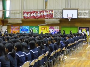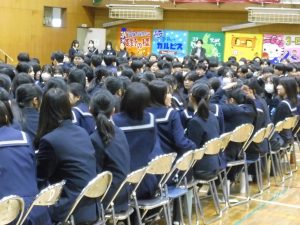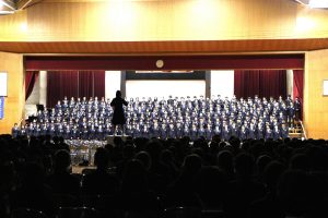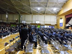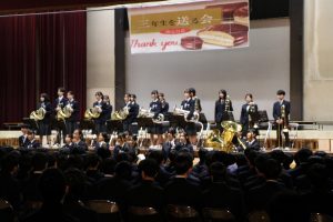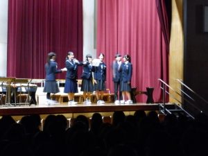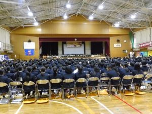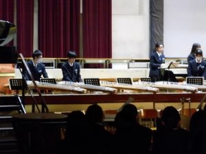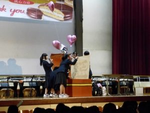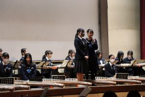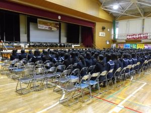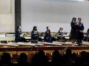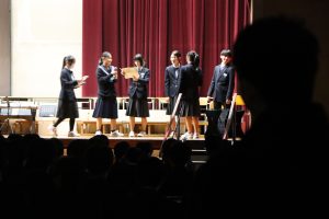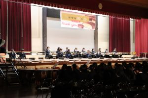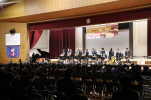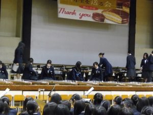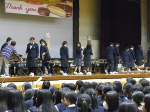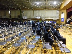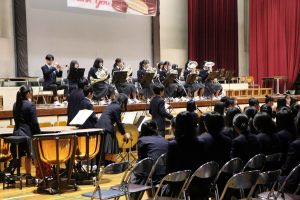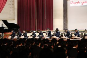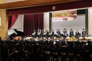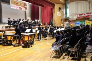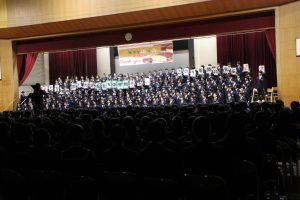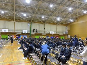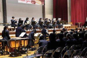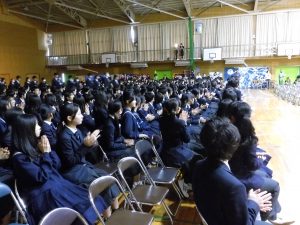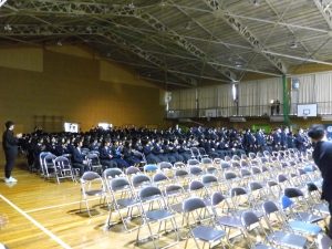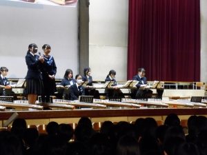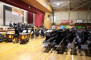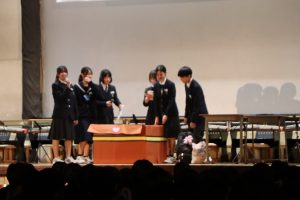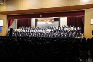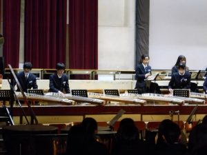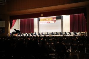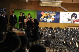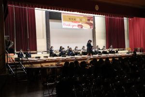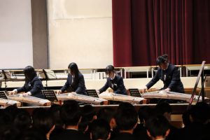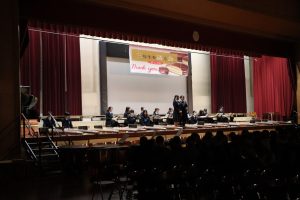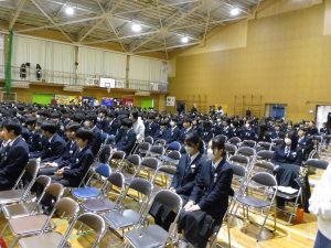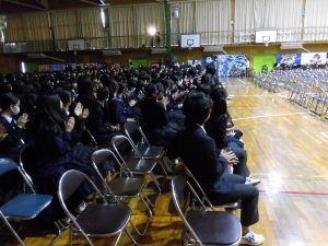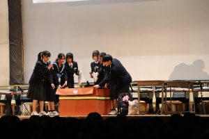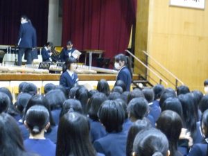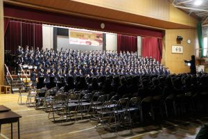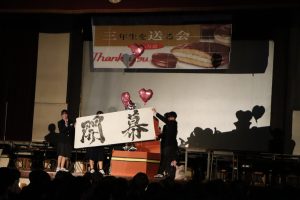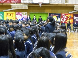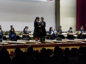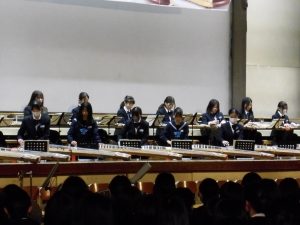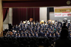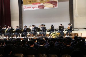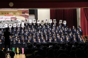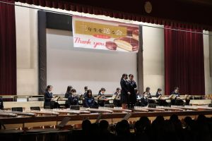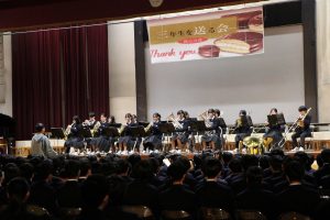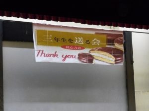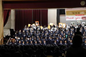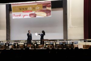 3月3日、あいにくの雨の日でしたが、盛大に3年生を送る会が行われました。プログラムは➀オープニング、②筝曲部の発表、③インタビュー「3年間で一番思い出に残っていること」「一番好きだった給食」「卒業をひかえた今の気持ち」、④吹奏楽部の発表、⑤1年生の発表、「キセキ」⑥2年生の発表、「あとひとつ」⑦ムービー、⑧3年生の発表、「ありがとう」⑨3年生代表のあいさつ、でした。3学年で一緒に過ごすことはもうありません。さみしいですが、大切な思い出の1ページとしてとっておきましょう。