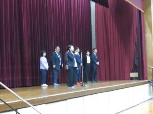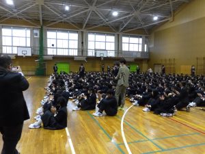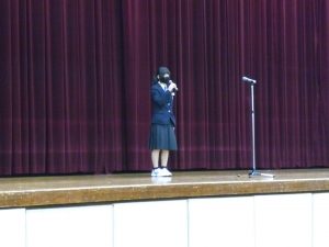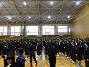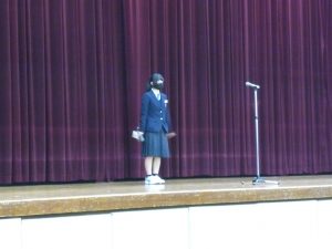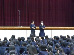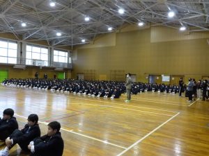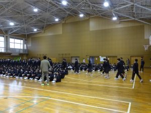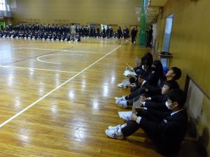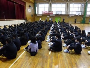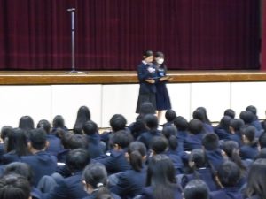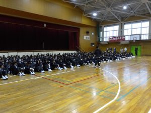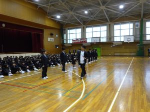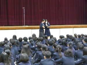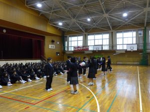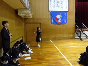 4月10日には歓迎式が行われました。新転任された先生方を紹介し、一言ずつあいさつをしていただきました。その後1年生代表生徒のあいさつがあり、1年生の各クラスにボールが贈呈されました。最後に情報委員会の生徒からタブレットの使い方についてのルールの紹介がありました。