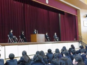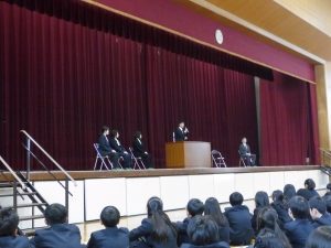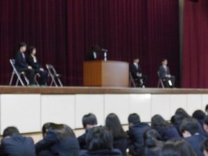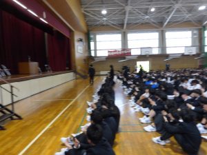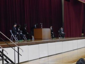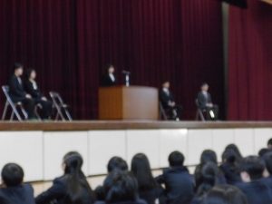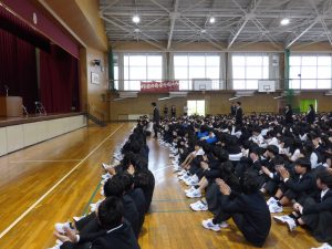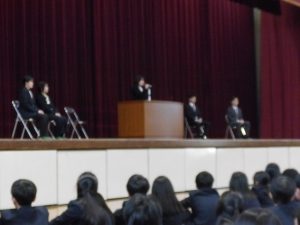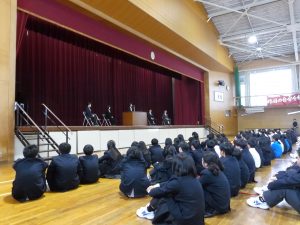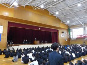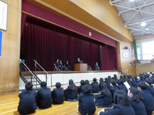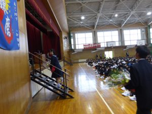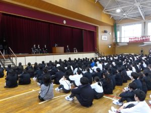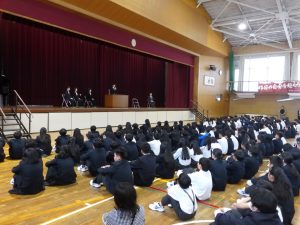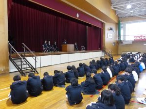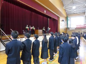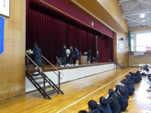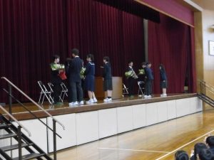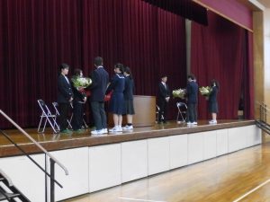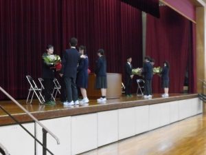 4月16日に離任式がありました。5名の先生方にお越しいただきました。先生方は、「『去年のクラスの方がよかった』などと思わず、前を向いていきましょう」「かけた情けは水に流せ、受けた恩は石に刻め」「東中生の活躍が聞こえてくることを楽しみにしています」…などとおっしゃっていました。花束贈呈の時には思わず涙ぐむ先生や生徒の皆さんもいました。先生方も生徒の皆さんと同じように新しい環境に慣れようと頑張ってみえます。過去の事は大切な思い出とし、前進していきましょう。