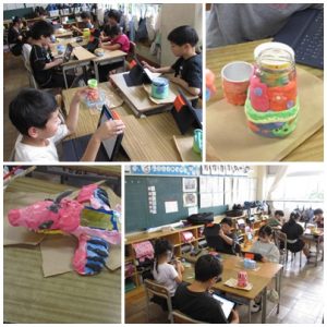 最後は、図工の授業のようすです。今日は、制作した「空きようきのへんしん」の作品の紹介カードを作成しました。タブレット端末を使って、作品名と工夫したところを見る人に伝わるように考えていました。色鮮やかな作品がずらっと並んでいました。ご家庭に持ち帰った際には、ぜひ話題にしていただきたいなと思います。
