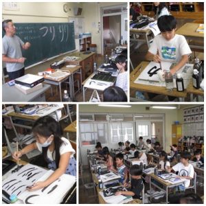 次に、書写の授業では、「ほ先がどこを通るかを考えながら書こう」をめあてに、「つり」という文字を書きました。写真のように、上手にほ先を使って、一画一画をていねいに書こうと真剣な表情。背筋はピーン、足の裏は床にピタんとしているところが上手に書くポイントですね。