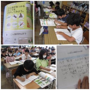 理科の授業では、前の時間に観察したこん虫のようすをノートにまとめました。「バッタってどんな場所にいたかな?」「なんでその場所をすみかにしているのだろうか?」など、観察したときに見て触って感じたことを思い出しながら書き込んでいました。たくさんの「なぜ」を見つけるところが理科の楽しいところ。これからもたくさん「なぜ」を見つけて、みんなに伝えてほしいなと思います。