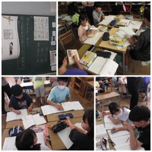下の写真は、4、5年生の授業のようすですが、仲間とかかわり合いながら、相談しながら、今日の課題を解こうと取り組む姿があります。本校の学習では、このように調べたり、考察したり、答えを導き出したりする過程で、仲間とかかわり合う活動を大切にしています。一人では解決できない問題もみんなで解決する。こんな力が育まれるといいなと思います。