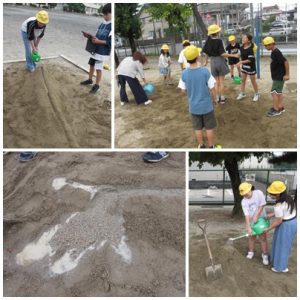 理科の授業は、砂場で「流れる水のはたらき」の実験を行っていました。土で作った斜面に水を流したとき、水のようすや地面のようすはどうなるのか観察していました。次回、教室で撮影した水の流れを見ながら、気づいたことをみんなで話し合っていきます。