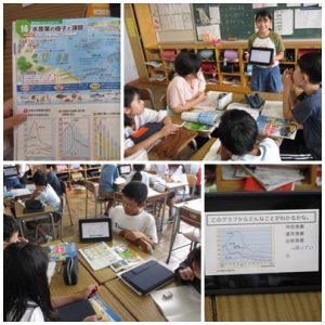 社会の授業は、これまで学んできた水産業について、子どもたちは先生役と児童役に分かれて、6つのグループそれぞれでミニ授業が行われていました。ある子は、かつおの水揚げ量について熱く語り、ある子はグラフから読み取れる漁業の種類について力説。児童役の子たちも学んできたことを教科書やのノートを見て確認するなど、学びの定着につながっているなと感じる授業でした。