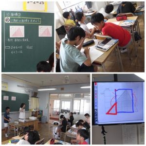 算数の授業は、「三角形の面積を求めよう」をめあてに、子どもたちは三角形を長方形に変えて、面積を考えていました。方眼紙に描かれた三角形を見つめる子どもたち。突然「そっかぁー、わかった!」と何かひらめいたようで、お隣さんと確かめ合っていました。算数のおもしろいところですね。